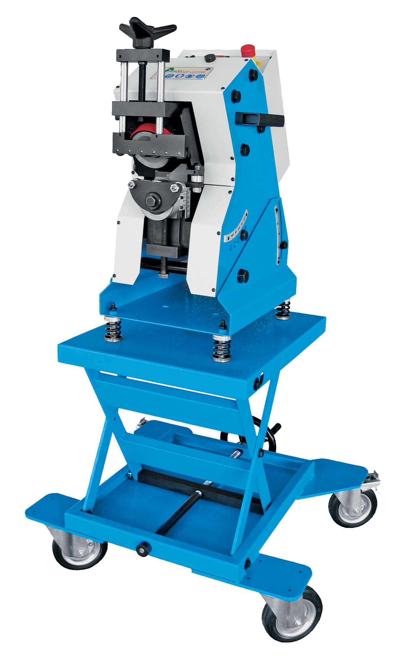 Профессиональный станок для снятия фаски на листовом металле. Обработка производится торцевой конусной фрезой с одновременной подачей. При малых размерах двигается обрабатываемая деталь, при больших – перемещается станок, для чего он оснащён тележкой с поворотными колёсами. На станке имеется угловая регулировка рабочего блока для снятия фаски под различными углами. Рабочий блок также регулируется по высоте посредством винтовой системы. На станке также может обрабатываться труба с внутренним диаметром от 110 мм.